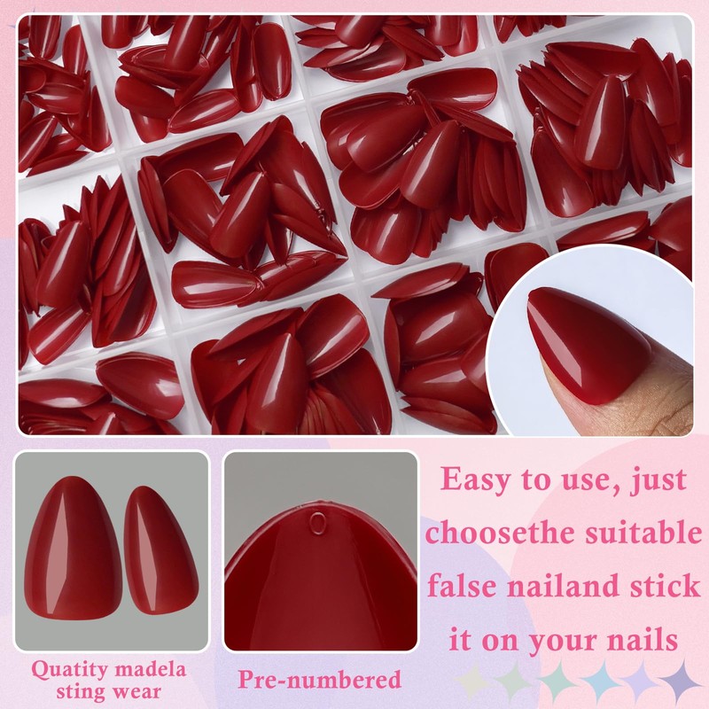 - Convenient to Apply:Only need to apply black glue on nails almond with nail glue or nail adhesive tab, then finish with salon-like nails within 10 mins. Almond fake nails with glue are easy and convenient for beginners! Our red false nails is also easy to file and trim, making fake nails more suitable for our natural nails. A few simple steps will make it easy for you to get the effect of doing a nail salon at home. Short red press on almond nails extension design perfect for any occasion!