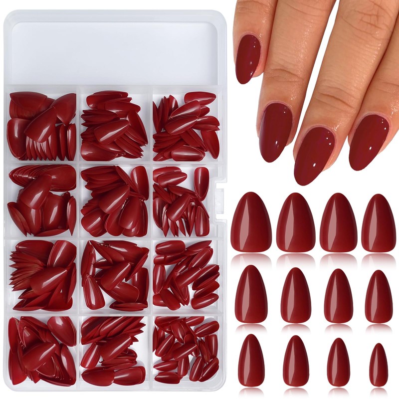 - 30 Nails in 12 Sizes: 360pcs full cover short red almond press on nails in 12 sizes( in a transparent plastic box with 12 grids. Each grid packed 30pcs false nails with glue in 12 different sizes).Glossy natural black color almond nails seamlessly match any skin tone.Professional results in minutes at home. Full size short nails press ons nail almond can fit for wide/small nail beds.