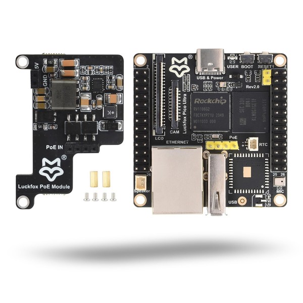 - Ideal for developers seeking a compact yet powerful development platform, the LUCKFOX Pico Ultra PoE Kit stands out with its comprehensive feature set, making it suitable for various embedded applications demanding reliable performance and connectivity.