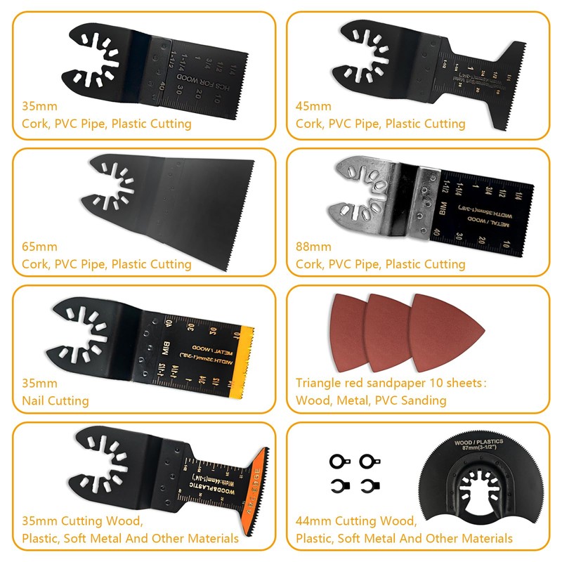 - Package contents: There are 3 different material combinations to choose from, including main saw blades made of high-carbon steel (35 mm/44 mm/45 mm/65 mm/88 mm), bimetal saw blades (35 mm) and titanium-coated saw blades (35 mm). The multi-saw blade combinations also come with sandpaper and washers to meet your different needs.