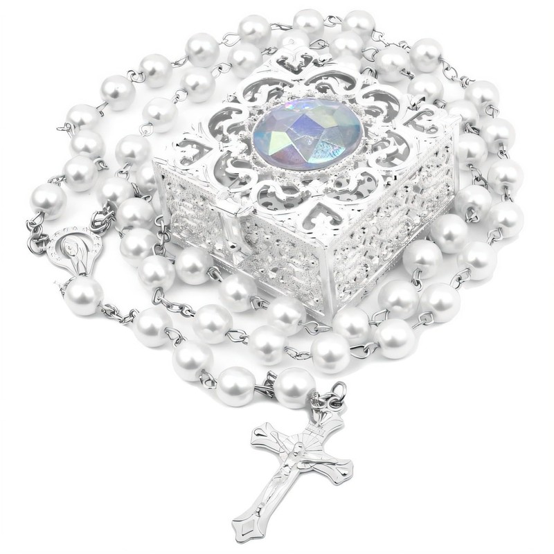 Lucktao Rosary Necklace, Rosary Necklace with Jewellery Box, White Beads, Rosary Catholic, Rosary, Cross Chain, Crucifix Chain, Rosary Car, Orthodox Chain, Rosary Chain Men Women, Zinc