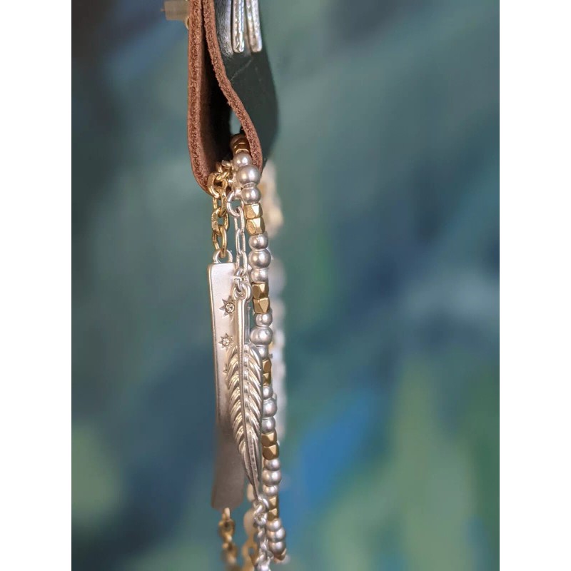 Complete the full look with this set featuring a Lucky layer bracelet decorated with textured beads, charms and chains. Then pair it with the matching star studs and pave feather earrings.