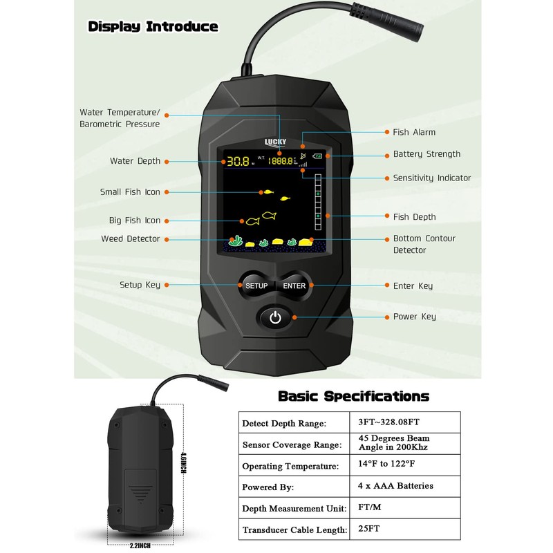 - Depth Finder Bottom Contour Readout : Portable fish finder detects and displays water depth,approximate fishes location, short & tall weeds, sand & rocks on bottom. LCD display offers you wide and clear visual experience. It detects in a 45° beam angle area supports maximum 328ft/100m water depth detection. This portable fish finder could help you to get more fishes and fun through its practical functions.