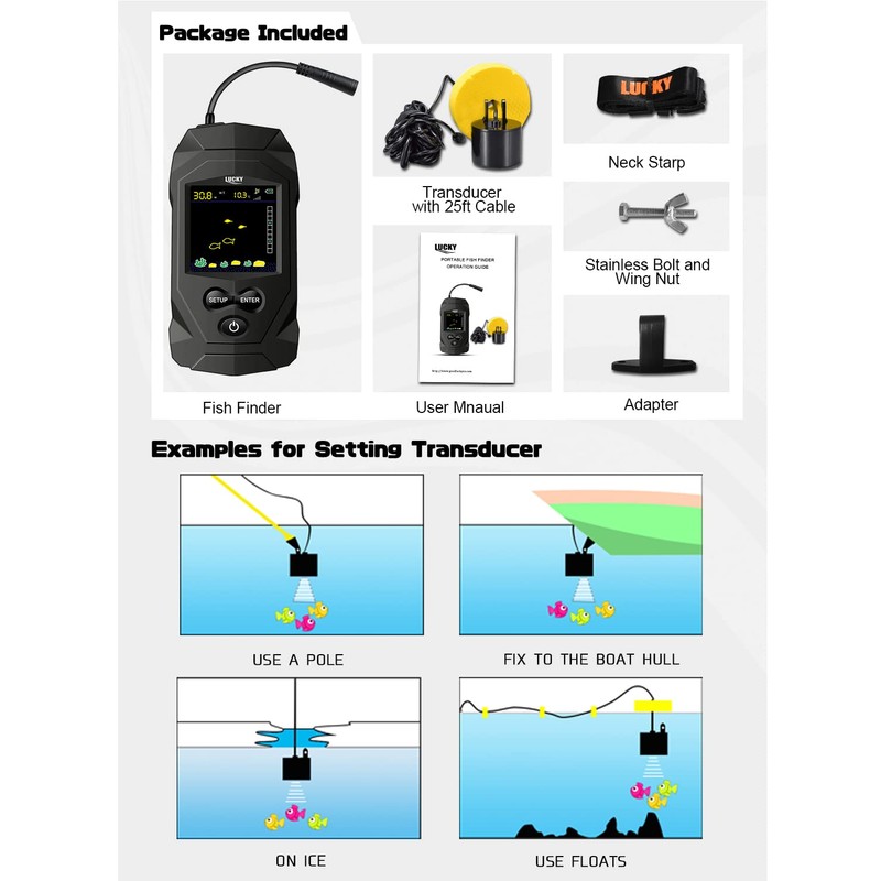 - Wide Applications : LUCKY depth fish finder is an ideal for boat kayak fishing,canoe and float tube fishing. It is the good kayak depth finder for your ourdoors activity. It will help you get more fishes in sea,shore,ice fishing and other circumstances. There are useful practical functions to help you for more fishes and more fun.
