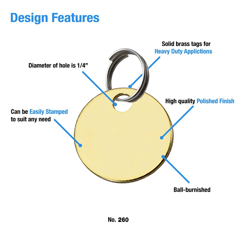 - Lucky line's Brass tags are made of solid Brass making them very robust and durable for heavy-duty applications where the tag may be exposed to rigorous use. These tags are simple and made to last for applications such as pet identification tags, long term site identification, and industrial use. These tags are so versatile; they can be used in a myriad of different ways and for many different industries. The large 1/4-inch diameter hole allows you to apply a larger and thicker ring or cable if needed. The tag is . 040 inches thick and looks slim and sleek but is still durable and heavy-duty. They can be bound or attached to various objects without adding weight or being cumbersome. The ball burnished finish to each tag gives it a brilliant shine and reflective finish that looks very clean and polished. The Brass tags can be easily Stamped for both decorative and functional labeling and identification. Popular for crafts and everyday home use, as well as industrial use. These Brass tags are a highly affordable option for organizing and labeling for a variety of needs. They are long-lasting quality Brass labels that will not need to be replaced often and will not fall off or break off. Lucky Line Products s the highest quality products that promise to deliver satisfactory results. We have been manufacturing products since 1961 and we continue to develop new products and provide exceptional service every day.
