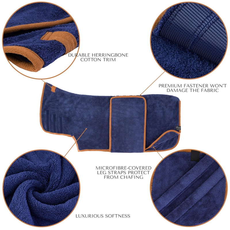 Why settle for less when you can have style and function?The Lucky Pooch dog drying coat is designed for a snug yet comfy fit, featuring adjustable belly straps and a long neck collar to keep your dog warm and dry. The stylish premium herringbone trim won’t wear out or fray like a cheaper dog towel wrap does after just one wash. With 9 sizes and a range of beautiful colors, you’ll find the perfect dog towel wrap to match your pooch's personality. Choose Lucky Pooch for dog robes for after bath – a cozy dog towel wrap and stylish dog drying coat combined for the perfect drying solution!