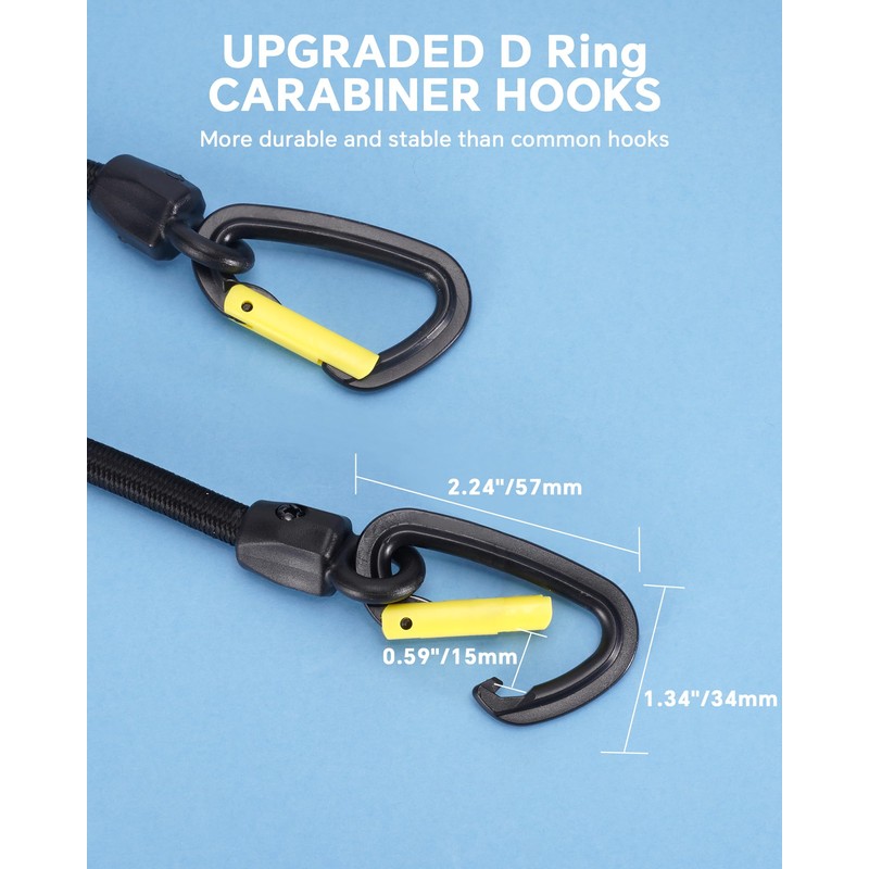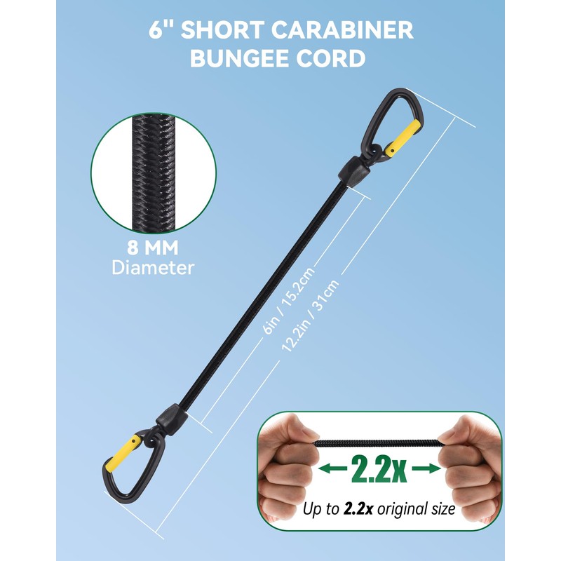 - 6-INCH SHORT D RING CARABINER BUNGEE CORD – Only 6'' length (excluding carabiner length), It can be stretched up to 12'' in length. No more complaints about the carabiner bungee cord being too long. Perfect for tying down all of your small equipment and tools.
