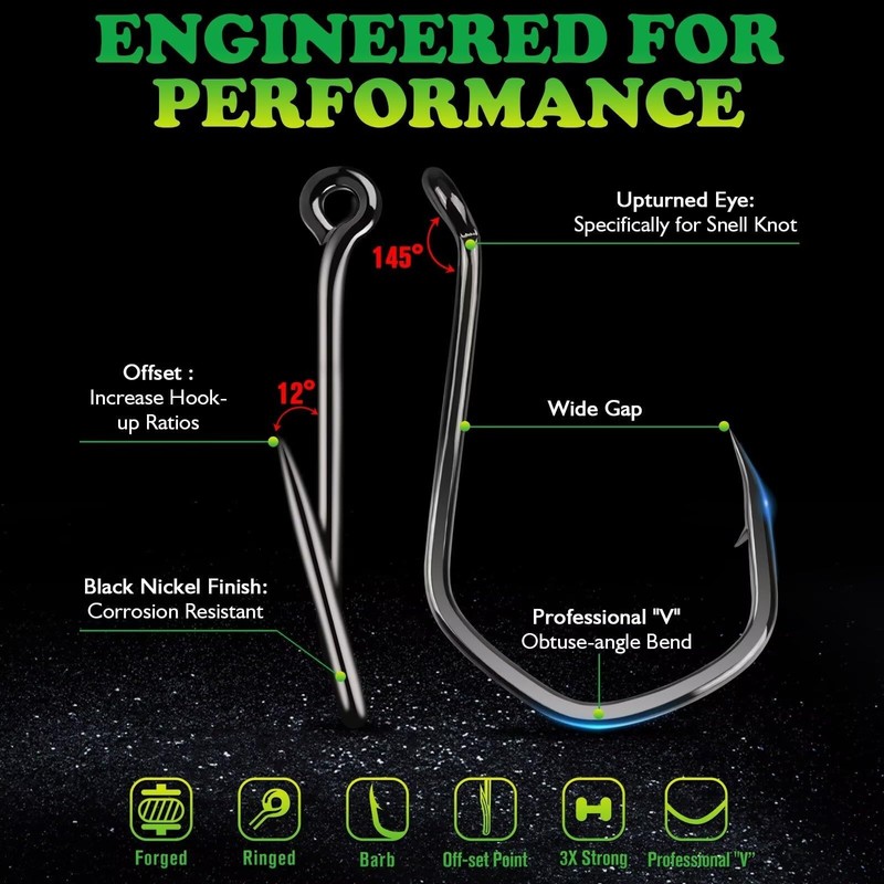 • Engineered for Performance: Octopus hooks are made of high carbon steel. Forged for strength and durability. 3X Strong gives you confidence when fighting fish! Black nickel finish & 12° offset technology make these hooks more corrosion-resistant and powerful. Whether you're a pro or a beginner, the fishing hooks provide strength & performance for fishing adventures!