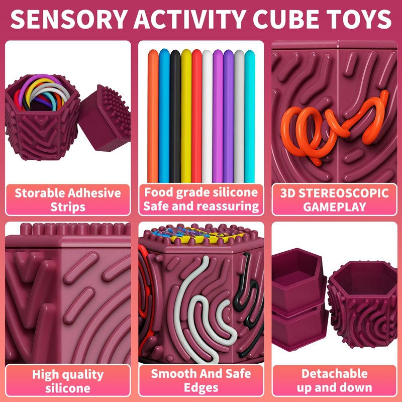 Luckynono 3D Sensorische Aktivität Board - Silikon Sensorische Spielzeug mit 10 Silikonfäden – Feinmotorik & Hand-Auge-Koordination für Kinder/Erwachsene, Anti-Stress Aktivitätswürfel (Rot)