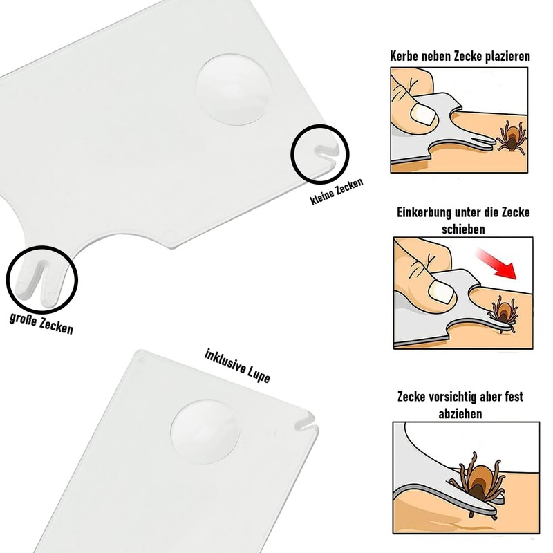 - Tick card with integrated magnifying glass, easy tick removal in humans and animals