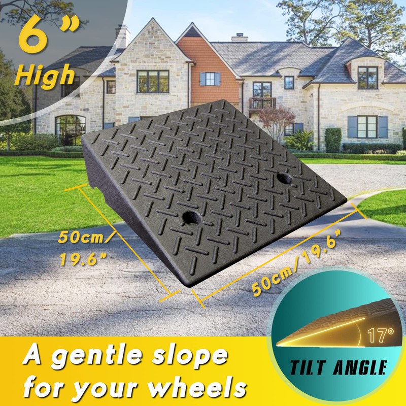- UPGRADED IN SIZE - 19.6” L x 19.6” W. 5" & 6" height optional which levels with most driveways and sidewalks. The extended length smooths out the slope to a tilt degree of 14 degree ( 5") and 17 degree ( 6")