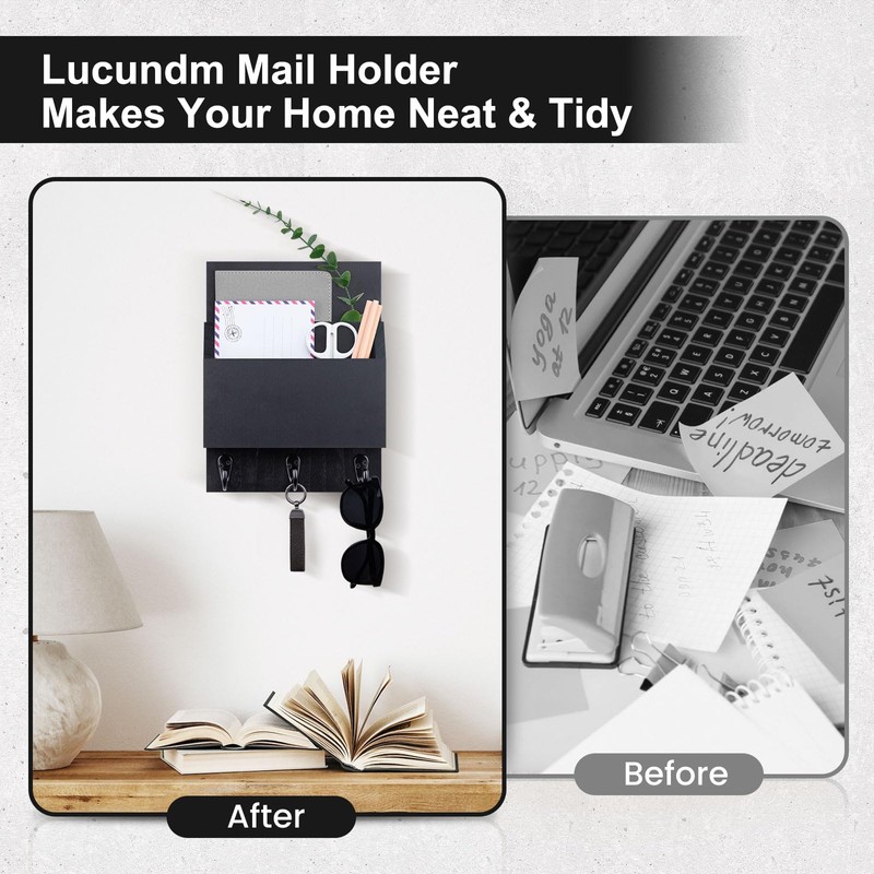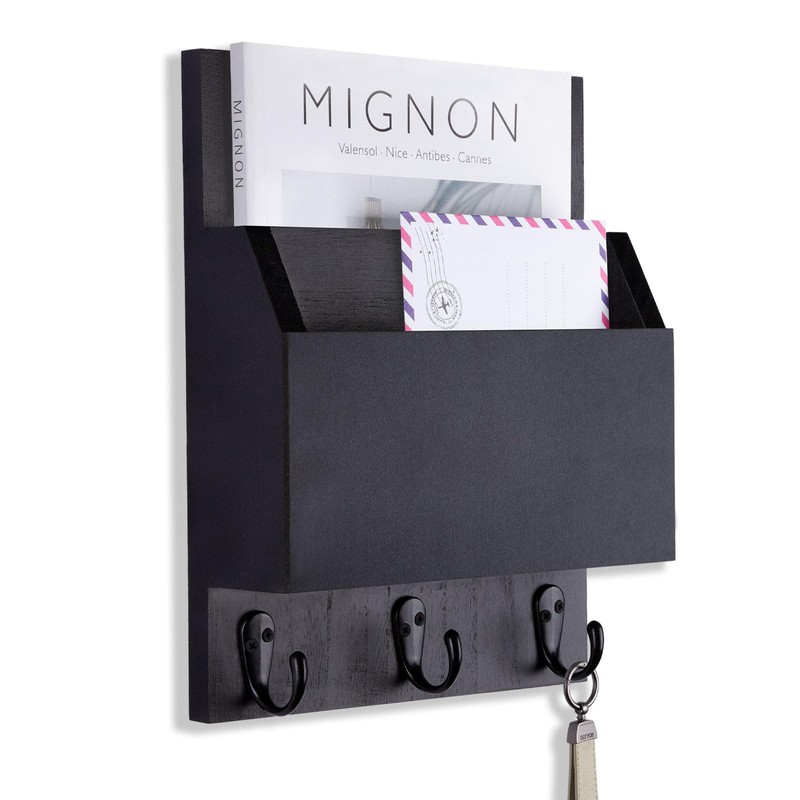 Lucundm Key and Mail Holder for Wall Mount, Entryway Mail Holder with 2 Slot, Key Holder with 3 Sturdy Hooks for Coat, Dog Leash, Decorative Key Holder (Black)