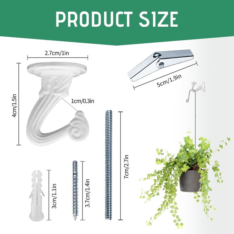 - Package Content: You will receive 20sets white ceiling hooks, each with 1hook, 1pointed screw, 1expansion tube, 1long bolt and 1toggle wing. These 20sets plant hangers are enough to meet your daily use needs