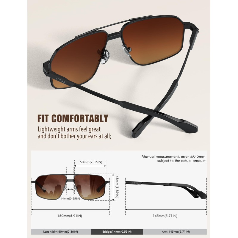 - GIFT PACKAGE & LIFETIME SUPPORT: Exquisite packaging includes: Sunglasses*1; Soft glasses pouch*1; Glasses cloth*1; Packaging carton*1. All LUENX customers enjoy lifetime support! Just send us a message through Amazon