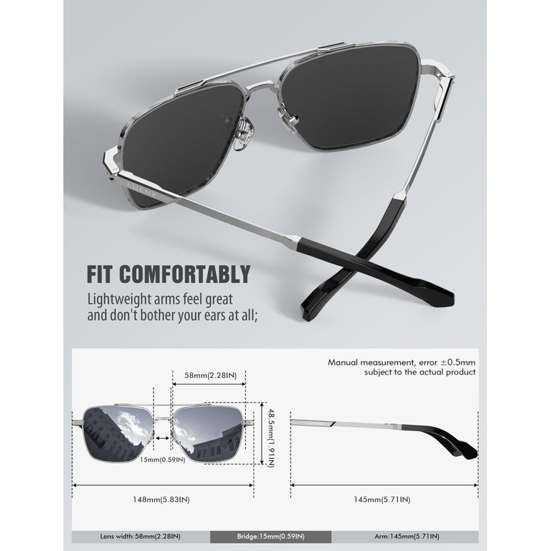 • PREMIUM ACCESSORIES AND PACKAGE: First Choice as a Gift. Square Aviator Style for Men & Women. Good for Driving & All Outdoor Activities for all Day. Include Sunglasses*1,Soft Pouch*1 ,Cleaning Cloth*1,Packaging Carton*1,Polarization Test Card*1