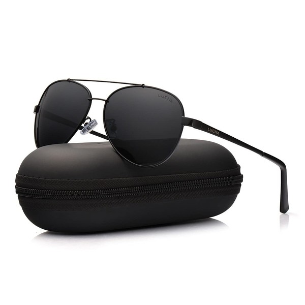 LUENX Men Women Aviator Sunglasses Black Polarized Metal Frame UV 400 60MM