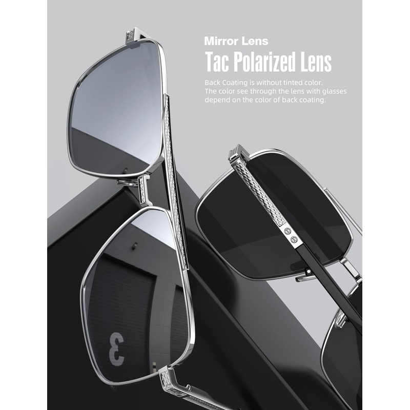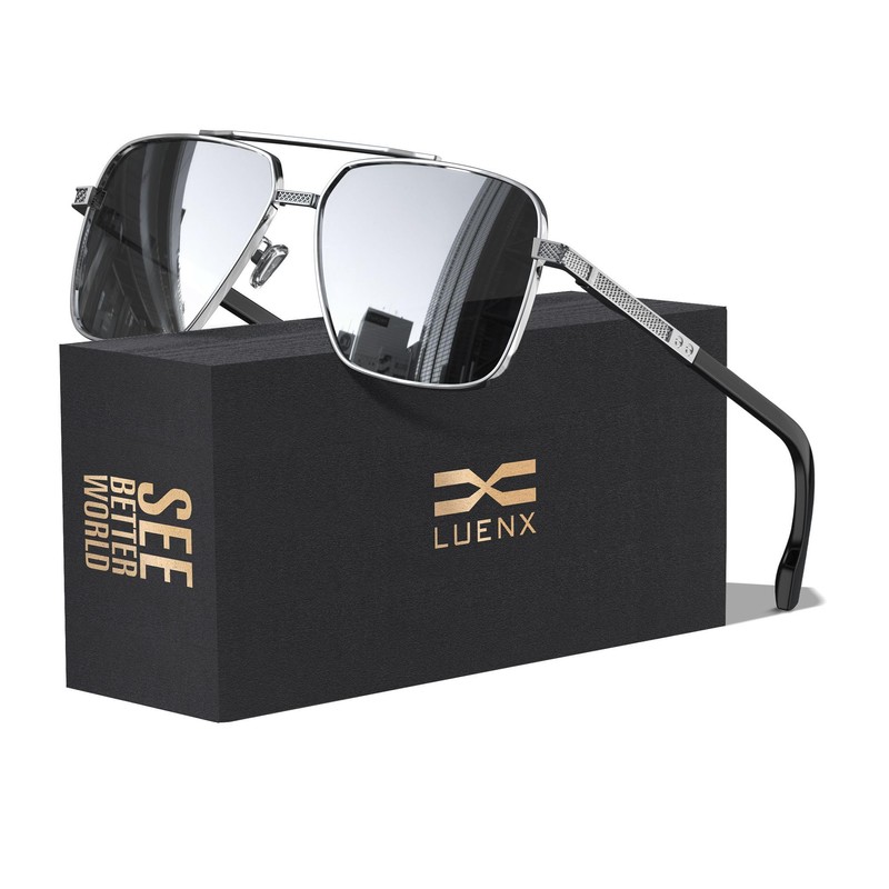 LUENX Polarized Square Aviator Sunglasses for Men, Trendy Retro Oversized Rectangular Mirrored Silver Lens Silver Metal Frame 61mm