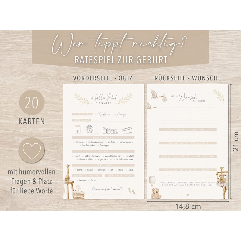 - Made in Germany – We attach importance to good quality and sustainability. The baby shower game is designed, produced, packaged and shipped completely in Germany.