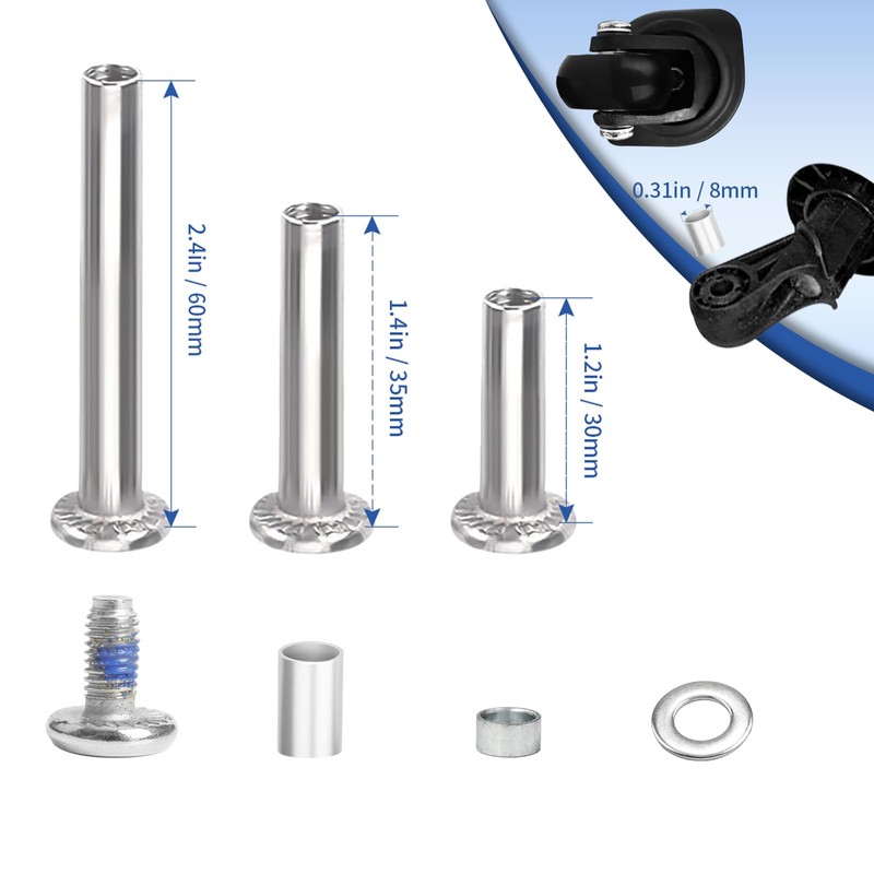 - Full Set Suitcase Wheels Repair Kit for Fix at Home-21mm Wide Bearings Roller,3 Size Wheels Axles (OD=6mm,L=30mm,35mm,60mm) for More Fix Needs,Mini Hacksaw to Cutoff Old Rivet,Spare shaft spacer used to fill axle slot if needed