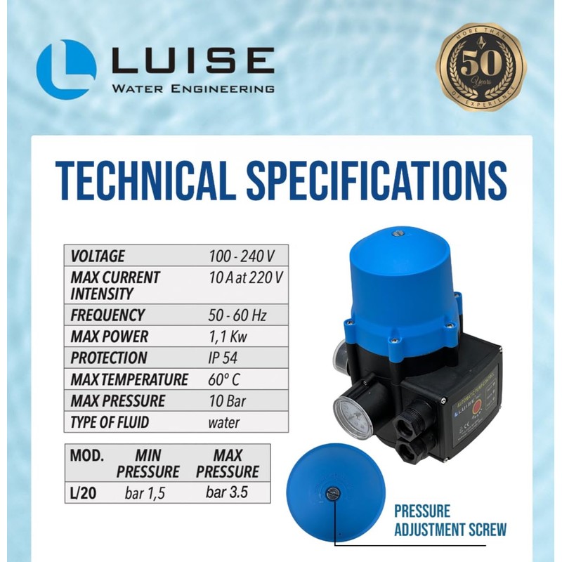 Luise (L/20) Automatic Regulator 110V | Electronic Pressure Control Switch Regulable for Electric Pumps | Automatic Pump Controller (1.5-3.5 bar) - G1 - IP54 - L730.0000