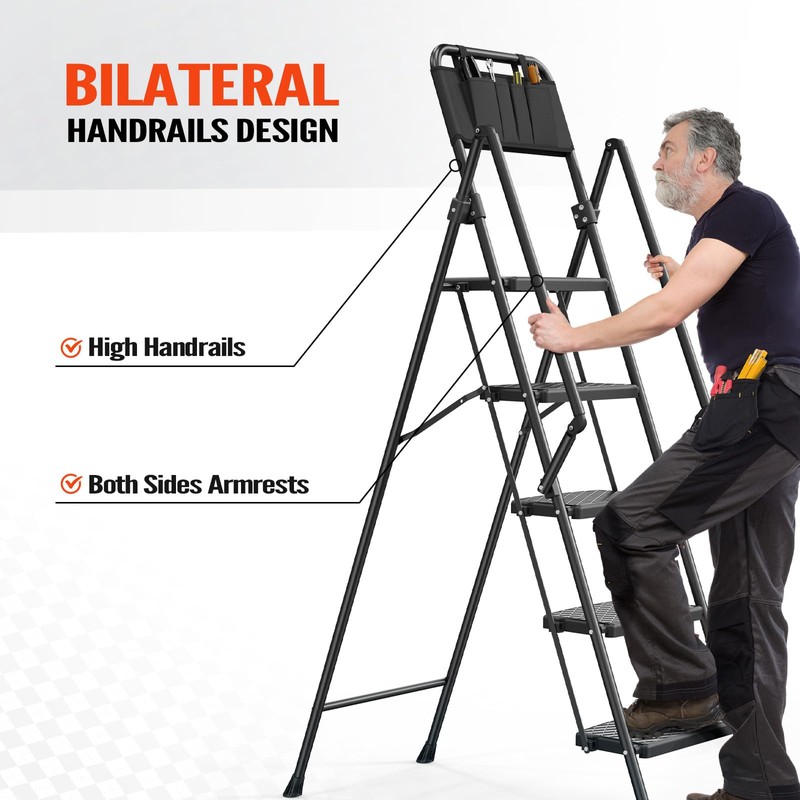 - 【Widened Step & Anti-slip Strip Pedal Design】 Specially customized for middle-aged and elderly friends, This foldable ladder desiged with higher safety performance. The 5 step stool ladder with the wider step and anti-slip pedal. It is very sturdy and safety to climbing up and down, even with your hands full of dishes, food, or cookware. The extended top hadfrails makes you feel very secure when on the top rung. The steps are wide and deep enough to comfortably stand on