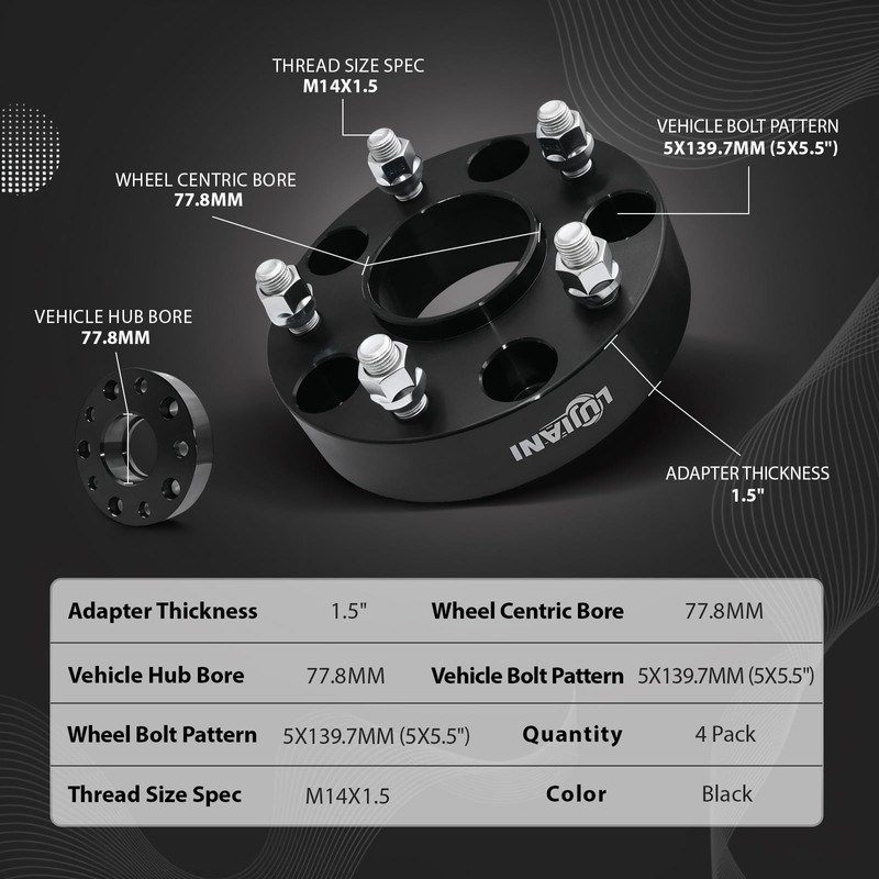 - 【DETAILED PARAMETER】Package Quantity: Pack of 4. Vehicle Bolt Pattern/Wheel Bolt Pattern: 5x139.7mm (5x5.5"), Hub Bore: 77.8mm, Spacer Thickness: 1.5" (38.1mm), Stud/Nut Thread Pitch: M14x1.5, Recommended Torque: 85-90 FT/LBS