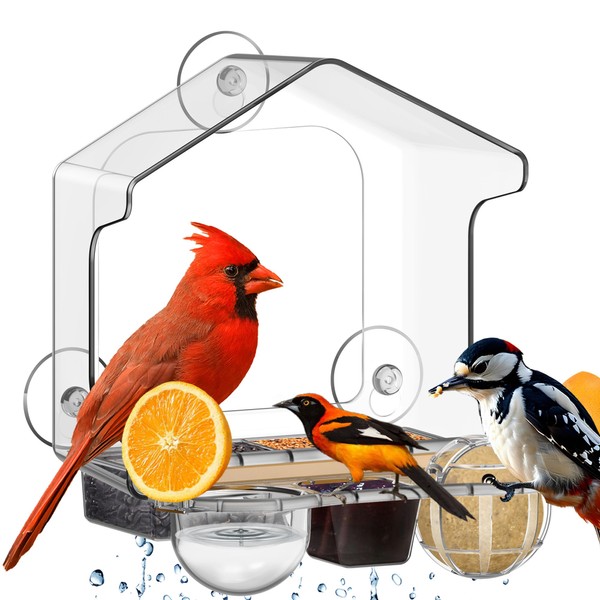 LUJII 6-in-1 Window Bird Feeder with Strongest Suction Cups, All-in-one Feeder for Bird Seed, Suet Ball, Mealworm, Oriole Orange Fruit, Jam or Water, Easy to Clean with 2 Removable Trays, Clear