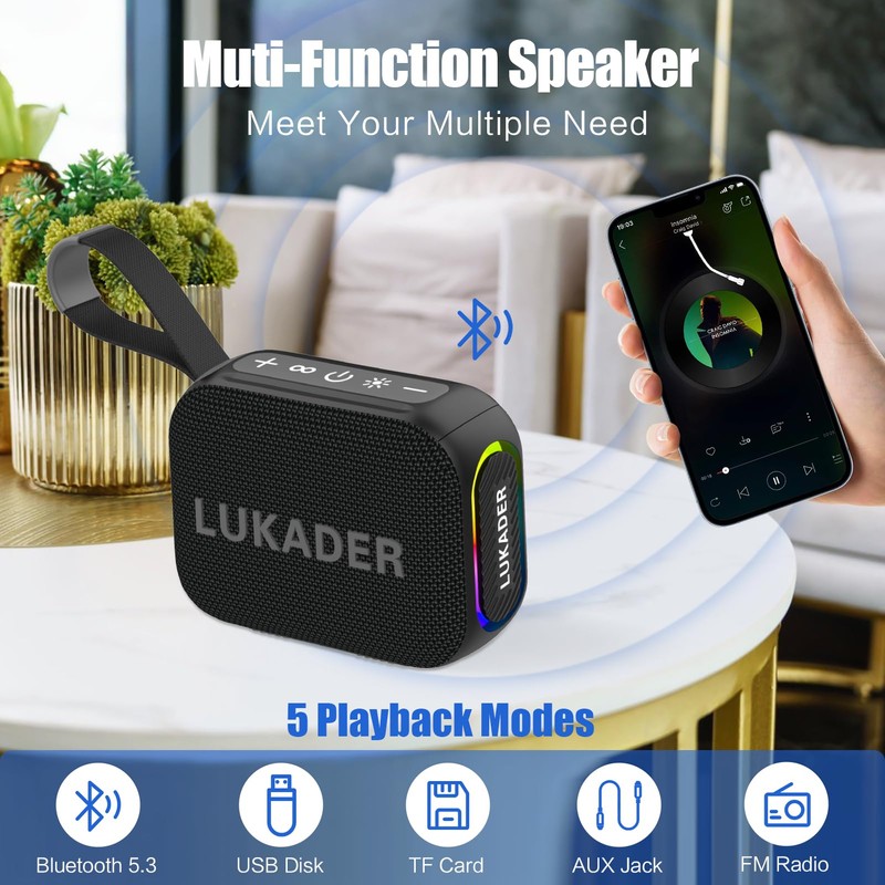 LUKADER Mini Bluetooth Shower Speaker with Lights, IPX67 Waterproof Portable Wireless Outdoor Speaker for Patio,Garden,Camping,Bathroomr,Travel,Bike,Party, for Adults Teens Women Men - Black