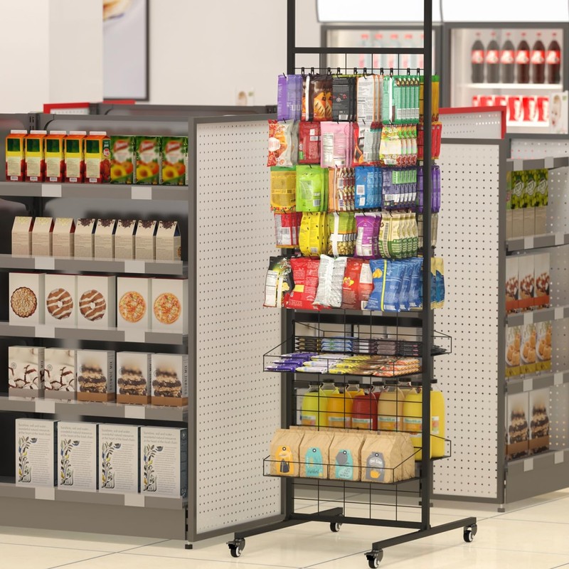 - Large Capacity Design:50 metal hooks,four shelves Storage,Our retail display stand is perfect display for retail shop or home to help you sort your items.Showcase and organize your snack,sunglasses, jewelry with ease using our sturdy and portable retail stand