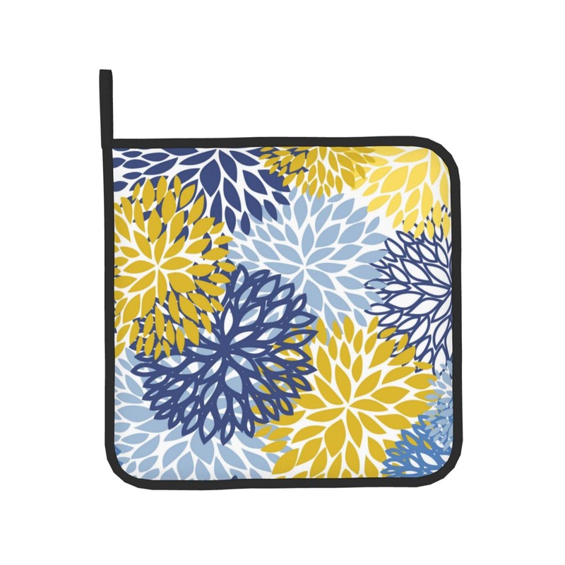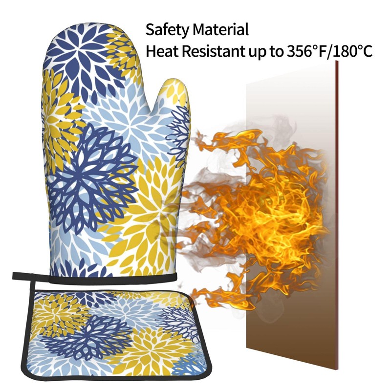 Lukbfall Blue Yellow and Navy Chrysanthemum Flowers Oven Mitts and Pot Holders 2 Pcs Set Daisy Floral Oven Glove and Potholder Suitable for Barbecues Baking Cooking Microwave