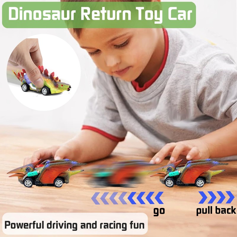 - Dinosaur pull back cars position the car for children birthday gifts 2-10 years on a flat surface, pull the dinosaur car slightly, then let the hand and the toy car can go forward. Children can compete to see who puts the car the distant distance.