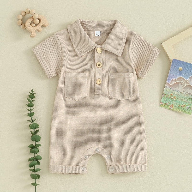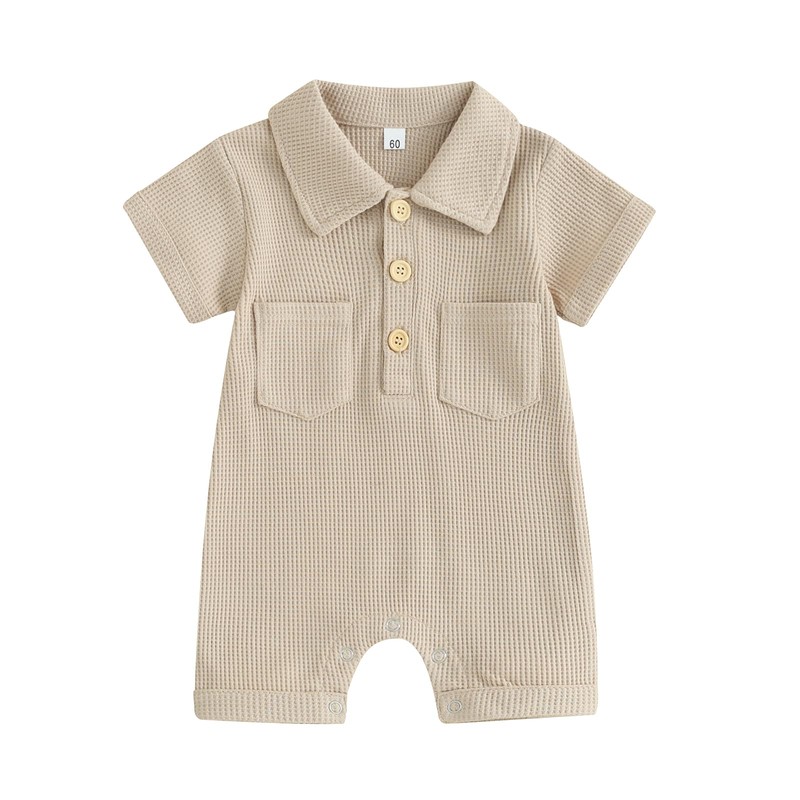 - Sizes: Newborn infant baby boy summer romper waffle knit jumpsuit romper solid color short sleeve button up collared bodysuit one-piece outfit,great for spring, summer, fall wear. Suitable for 0-3 months, 3-6 months, 6-9 months, 9-12 months newborn infant baby boys
