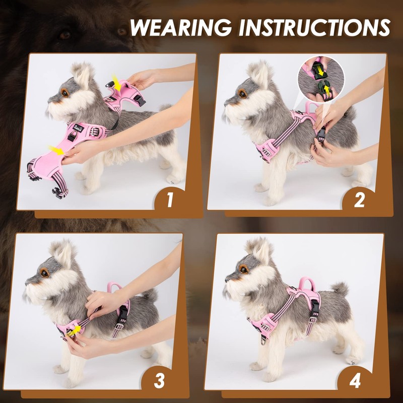 1.Our dog harness is simple designed and easy to wear. With four adjustable straps and two quick release buckles, it’s easy to put on and take off.