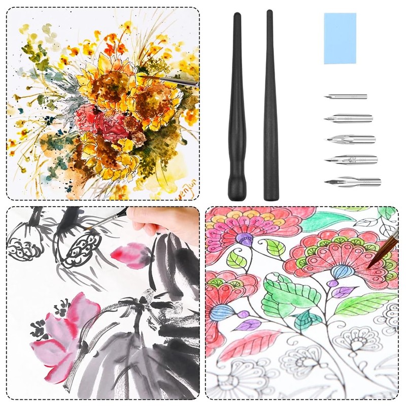 LuLiyLdJ Calligraphy Pen, Calligraphy Manga Drawing Nib Pen Sign Pen Holder Set Drawing Comic Pen with 2 Nib Holders 5 Nibs 1 Eraser for Caricaturist Artists 8 Pieces