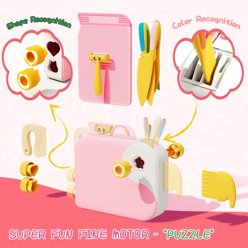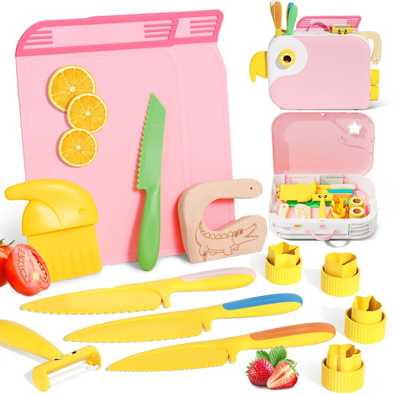 Lullulii Montessori Kitchen Tools for Toddlers,Kids Knife for Real Cooking,Toddlers Knife Set with Storage Box Kids Safe Knives Children Cutting Set and Peeler,Montessori Toys for Kitchen Set -Pink