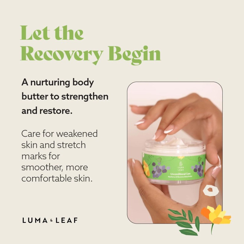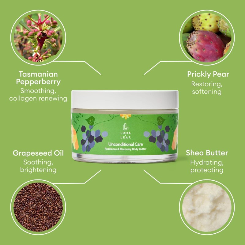 Introducing Luma & Leaf's Unconditional Care Body Butter, an exquisite formulation designed to cater to the unique needs of pregnant women. This luxurious belly butter for pregnant women is meticulously crafted to provide unmatched care and nourishment to your skin during one of the most beautiful yet demanding phases of life. Our tummy butter is infused with the extraordinary benefits of Tasmanian Pepperberry, known for its smoothing and collagen-renewing properties. This rare ingredient works diligently to visibly diminish the appearance of stretch marks, making it an essential addition to your prenatal skincare regimen. The inclusion of Prickly Pear extract further enhances our belly balm for pregnant women by promoting skin renewal and minimizing scarring. Its restorative and softening action fortifies your skin's natural barrier, ensuring elasticity and resilience. Coupled with the soothing and brightening properties of Grapeseed Oil, this body butter offers a holistic approach to skincare. Rich in Shea Butter, known for its hydrating and protective qualities, our formula offers deep nourishment, transforming your skin into a canvas of supple and radiant beauty. This stretch mark cream for pregnancy is an ideal choice for women seeking to prevent and reduce stretch marks effectively. Luma & Leaf's Unconditional Care Body Butter stands as a beacon of hope for those in search of a reliable tummy butter for stretch marks. Embrace the journey of motherhood with confidence, knowing that your skin is receiving the highest level of care. Celebrate your body's transformation with the assurance that Luma & Leaf's Unconditional Care Body Butter is actively working to support your skin's health and beauty, making it a must-have for every expectant mother. Discover the elegance of pregnancy lotion for stretch marks redefined, and let your skin shine with the brilliance of life.