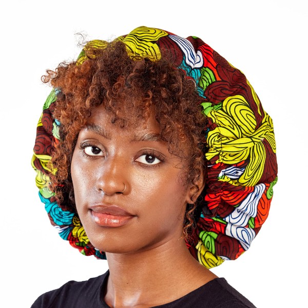 LuMay Satin Lined Ankara Double Layer Adjustable Sleeping Bonnet for Women and Men Natural Curly Hair, Earth