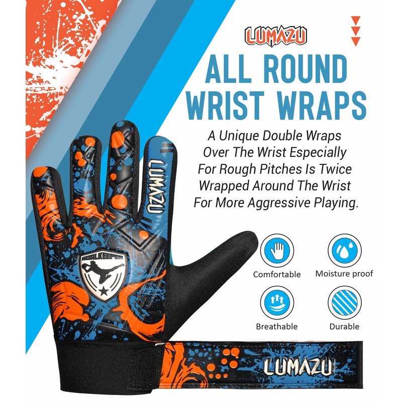 - Comfortable Fit: Kids goal keeper gloves with Fingersave Engineered with a snug and comfortable fit, LUMAZU uses double design strap elasticated wrist with adjustable velcro strap to give your child extra fitting and better dexterity and flexibility, enabling natural hand movements while playing and reduce the risk of spraining your child's wrist
