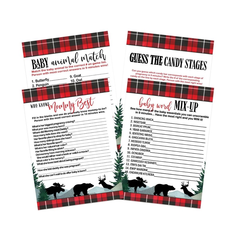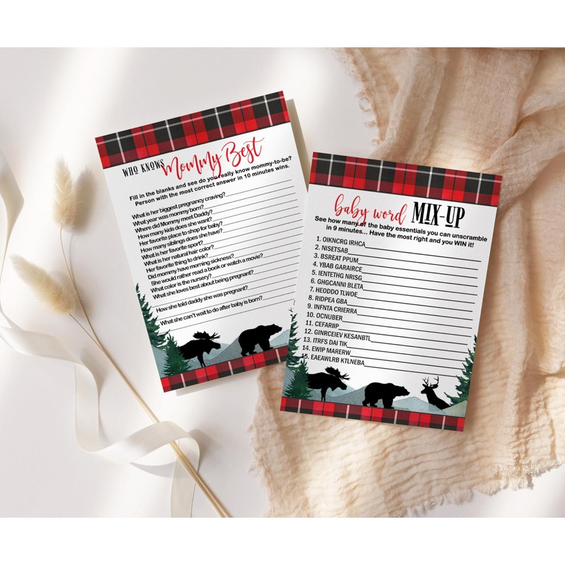 Lumberjack Baby Shower Game Cards, Word Scramble, Who Knows Mommy Best, Guess The Price, Candy Bar, Animal Matching, Double Sided, 25 Each