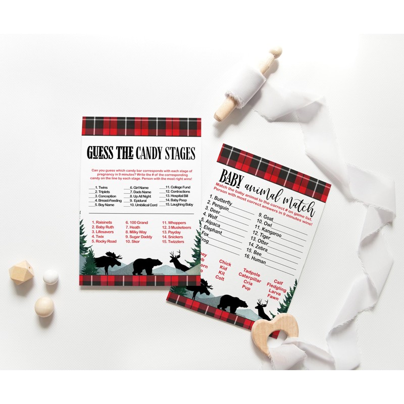 Lumberjack Baby Shower Game Cards, Word Scramble, Who Knows Mommy Best, Guess The Price, Candy Bar, Animal Matching, Double Sided, 25 Each