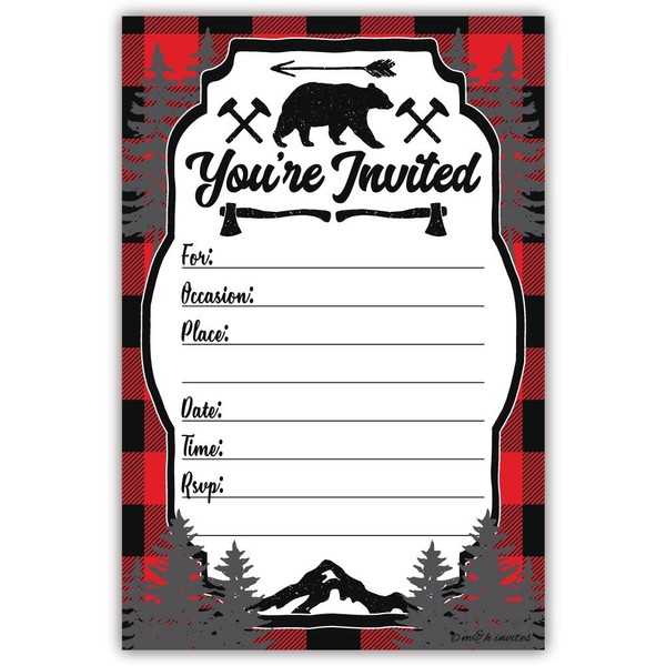 Lumberjack Rustic Birthday Party or Baby Shower Invitations (20 Count) With Envelopes