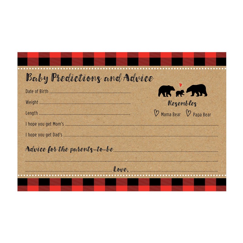 - LUMBERJACK THEMED BABY PREDICTION CARDS - Features a playful family of bears and space where guests can write their predictions and advice for the parents-to-be. Package includes 24 cards.
