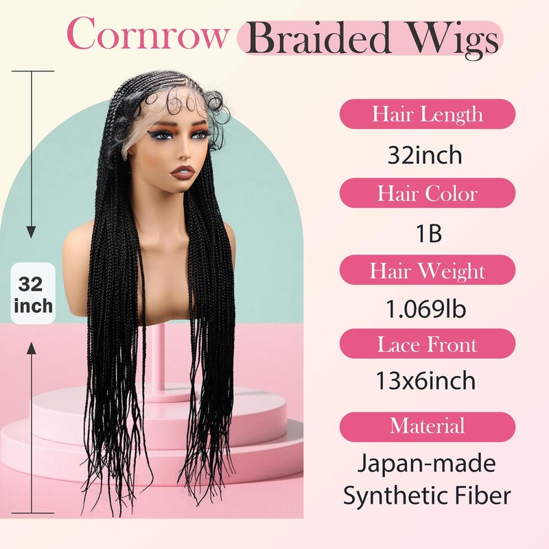lumeng 13X6 HD Lace Front Cornrow Braided Wigs for Women Knotless Braided Wigs 32" Box Braid Wig with Baby Hair Premium Synthetic Natural Looking Hair Black Braided Lace Front Wigs