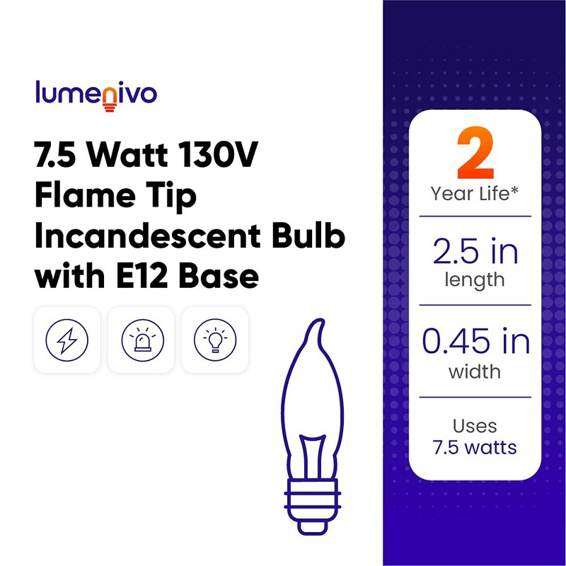 lumenivo 7.5 Watt Light Bulbs 120V/130V Bent Tip Candelabra, Flame Tip Chandelier Bulbs, Flame Shaped Light Bulbs Standard Base – Replacement Christmas Candle Tip Incandescent E12 Bulbs – 2 Pack