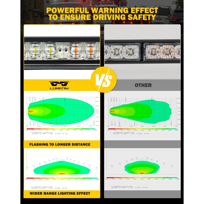 - ENHANCED VISIBILITY FOR ENHANCED SAFETY - Elevate your vehicle's safety with our dash strobe flashing lights. These warning lightbars a true emergency traffic signals with their 2-in-1 design. Each side features 4 modules, housing a total of 32 high-power LED chips. The upgraded 5D lens design dramatically amplifies brightness, even in bright daylight or adverse weather conditions, casting a wider and farther-reaching illumination.