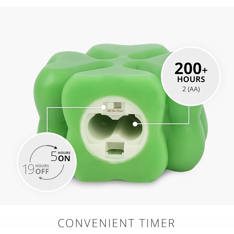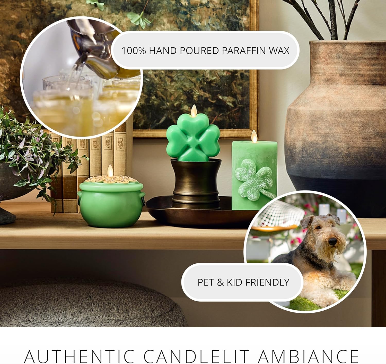 The Luminara Classic Green 4-Leaf Clover candle is designed to look just like a real wick open-flame candle. The body is crafted from hand-poured 100% paraffin wax around the electric core. The texture is just as smooth and realistic as it looks, and creates a lovely ambiance in any room. It's perfect for your St. Patrick's Day display on the mantelpiece, bookshelf, or dining table centerpiece. Or, display year round to showcase your Irish pride!