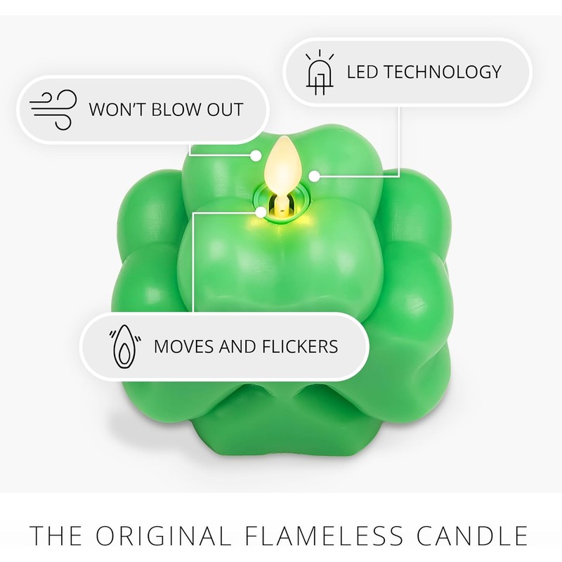 Using patented Flickering Real-Flame technology, the delicate plastic flame tongue flickers in the warm white LED light. The wax body also lights up, glowing just like an actual flame candle. The gentle illumination is perfect for creating a subtle, yet cheerful decoration. It also makes a darling little Saint Patricks themed nightlight for children.