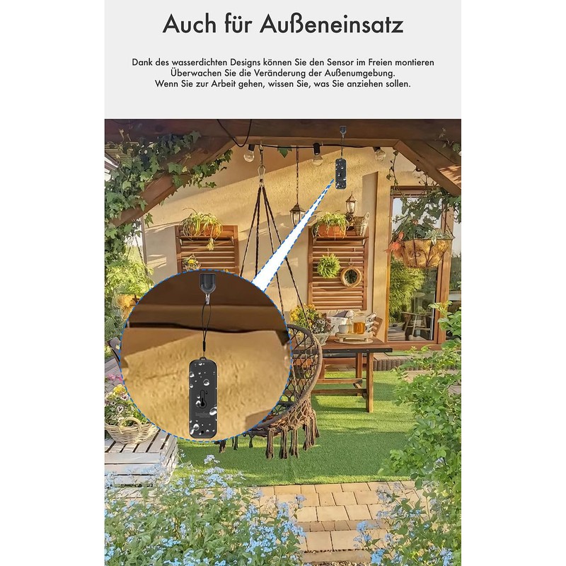 - 4 temperature and humidity sensors including 4 lanyards, 4 adhesive pads and instructions in German. Moisture detectors – weatherproof and smart home capable: temperature and humidity check via app