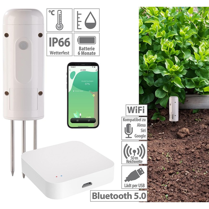 - Ideal for sharing with an irrigation computer Also ideal for automatic control of irrigation valves via smart scenes Weatherproof housing: IP66, 6 months battery life Suitable for use between plantings Free app "ELESION" for worldwide measurement value display, data evaluation and much more. Measurement query via Amazon Alexa, Google Assistant and Apple Siri