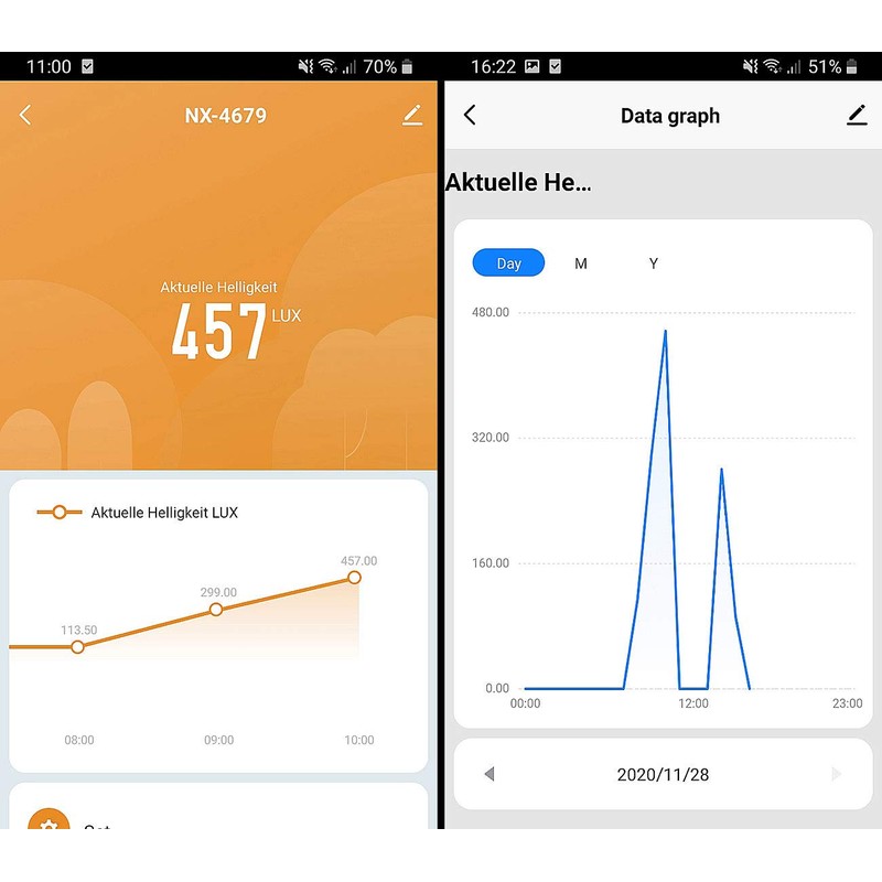 Just at the right moment: The sensor measures the brightness of the environment every 5 minutes and then sends the value to your app. For example, the light does not turn on too early and you never sit in the dark.